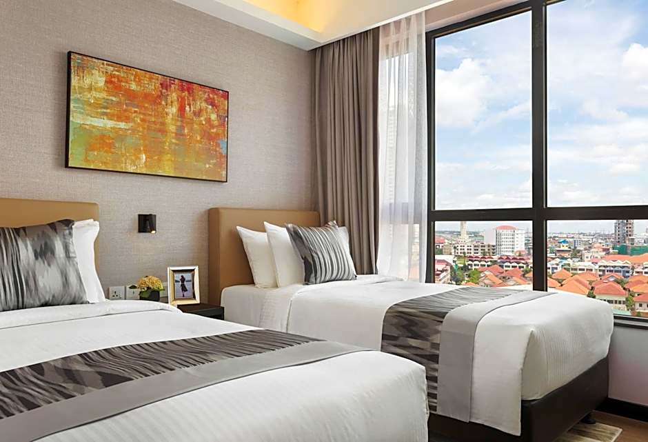 1-Bedroom Executive is 657 square feet and includes a king-size bed 150-183 width plus living room, balcony, extra beds on demand, and cable tv.